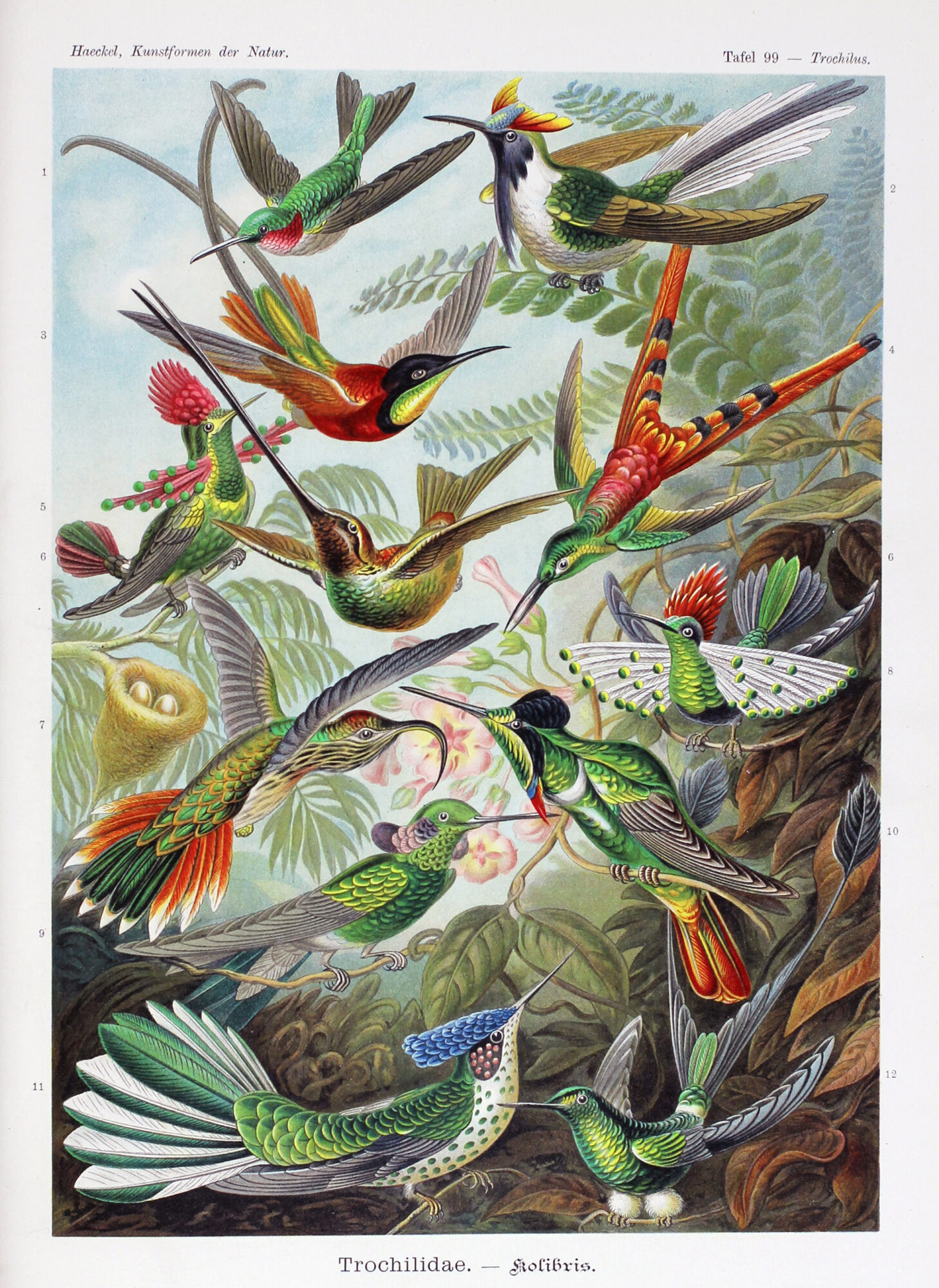 This plate from Kunstformen… (1904) depicting different hummingbird species shows how beautifully Haeckel married science with art.