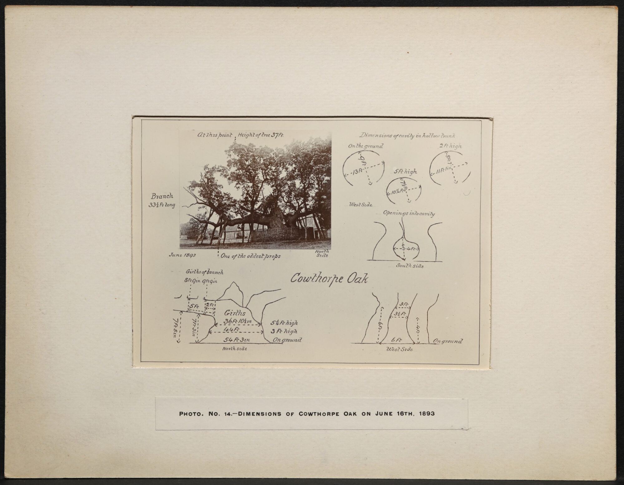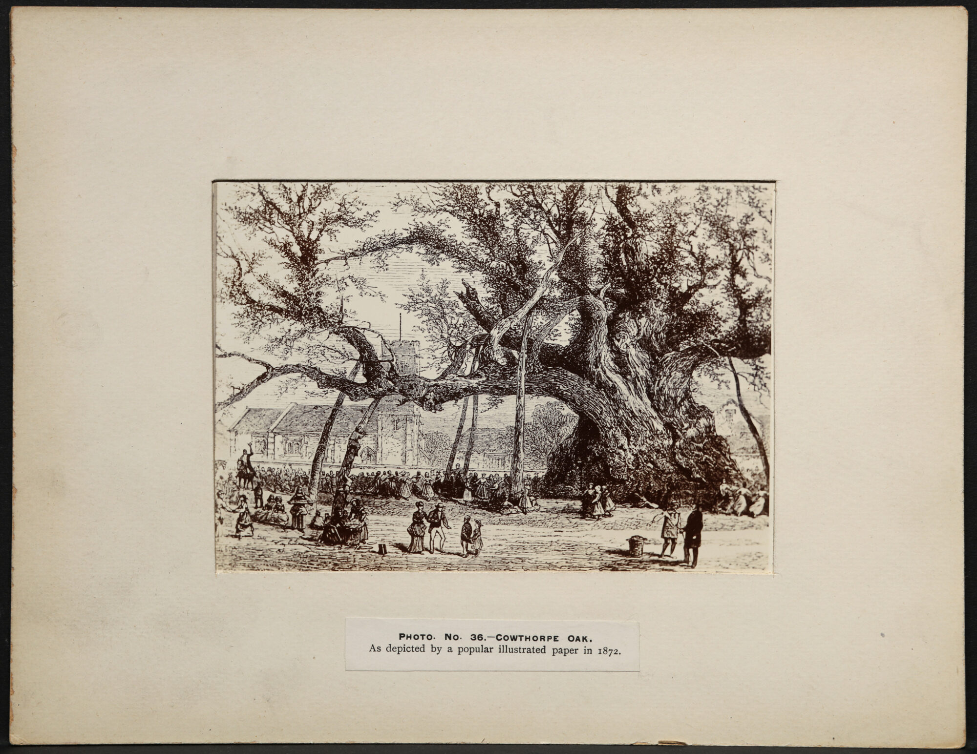 The oak was situated in a field next to the now disused St. Michael’s church in the village of Cowthorpe, North Yorkshire. Due to its immense size and age the tree drew in crowds of people, including various artists who attempted to capture its majesty in paintings and sketches. Diagrams and photographs of the tree and surrounding area were also taken by the botanist John Clayton (1847-1933) who visited it in 1893.