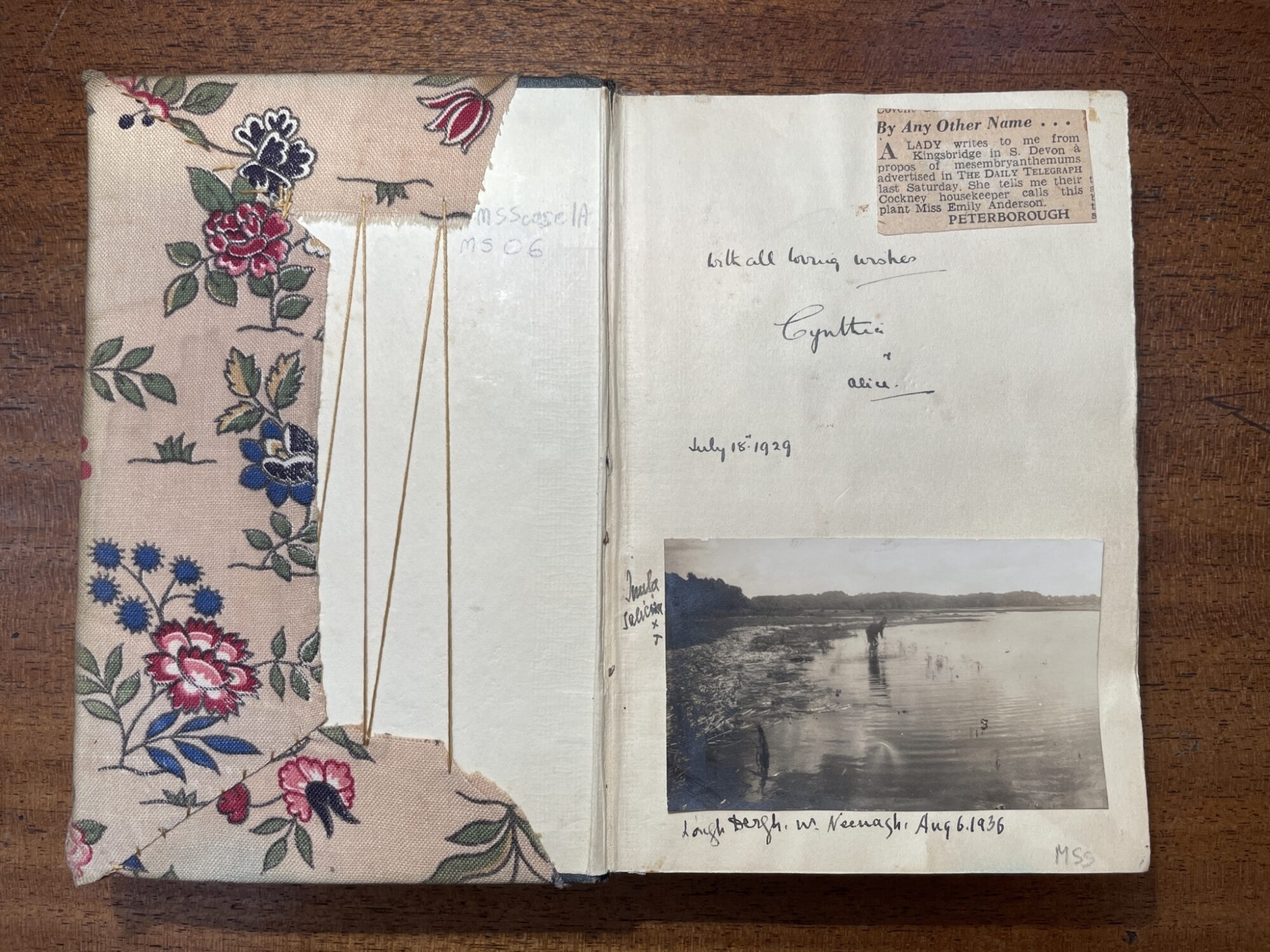What immediately attracted me to this Treasure of the Month was its outward appearance: a colourful cloth is carefully stitched as a cover. It signalled that the book was precious to its owner, who intended to use it and take good care of it. Opening its pages, I was initially disappointed to find that it was a published book, rather than a notebook: the 1924 edition of W. H. Fitch’s Illustrations of the British Flora (MS/6). Yet it was housed amongst our manuscripts, because the owner had used it as such, carefully colouring its black and white illustrations every time she came across the plant in the wild or in gardens, and annotating each image with the date and location of when and where she observed said plant. Remarkably, only eight plants in the book were not given this treatment, a testament to its owner’s diligence as an amateur botanist.