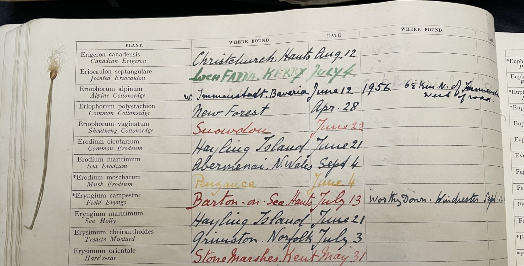 Further digging into our collections revealed a second ‘notebook’ by the same amateur botanist, this time a printed fifth edition of the Wild Flower Society Field Botanist's Diary, which was meticulously filled out between the years 1927 and 1939 (MS/576).