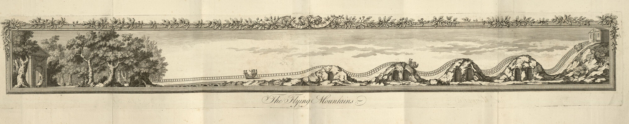 Our current exhibition, Wonder, hosts whimsical categories of unexpected objects, including one on ‘Flights of fancy’. Along with a flying fish, a rabid-looking flying squirrel, and a very surprised owl, certainly one of the fanciest flights in this case is a long fold-out plate called ‘The Flying Mountains’, depicting the ‘first track-bound and wheeled roller coaster in the world’ [1].